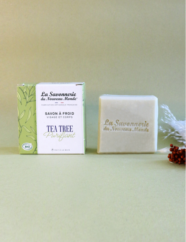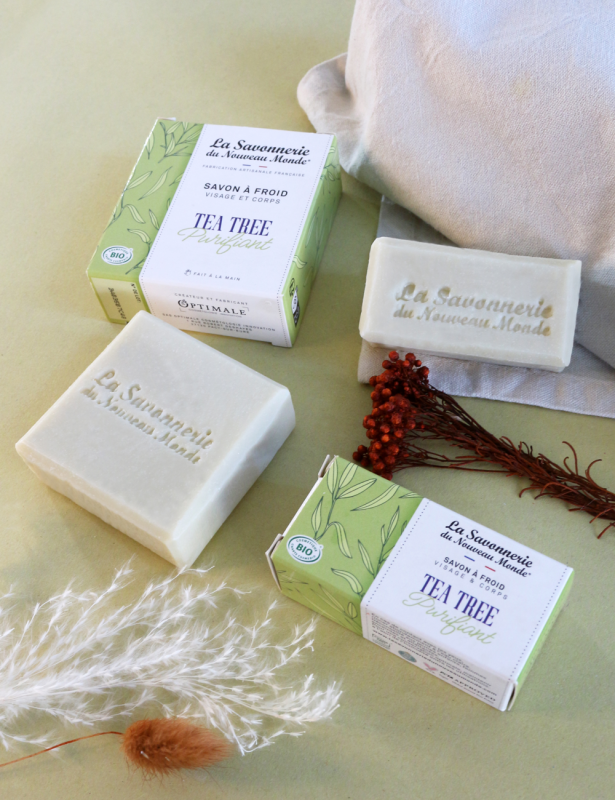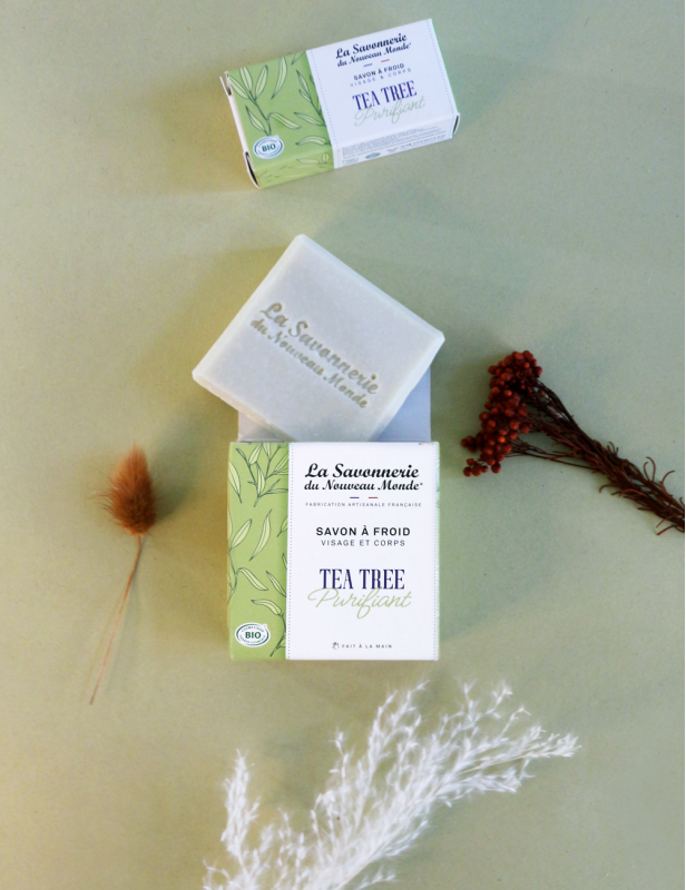 TEA TREE Purifiant est un savon saponifié à froid 100% végétal, bio, cruelty free & vegan (certifié par la PETA) et fabriqué en Normandie de façon artisanale.